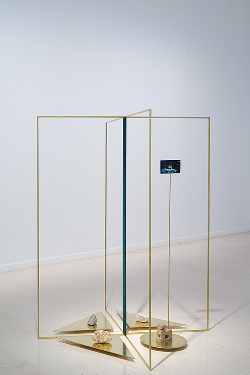 La parte principal de la exposición consiste en una serie de esculturas de varilla fina de latón atadas con hilo teñido y objetos artesanales turísticos relacionados con las deidades y el agua, todo ello dispuesto en el suelo. Cada una de estas esculturas incluye a su vez una postal publicitaria de los años 60, en la que aparecen las elaboradas fuentes de colores claros de uno de los hoteles balneario. Así pues, a través del distorsionado prisma del turismo, estas esculturas pueden interpretarse como fuentes dotadas de cualidades espirituales y curativas.